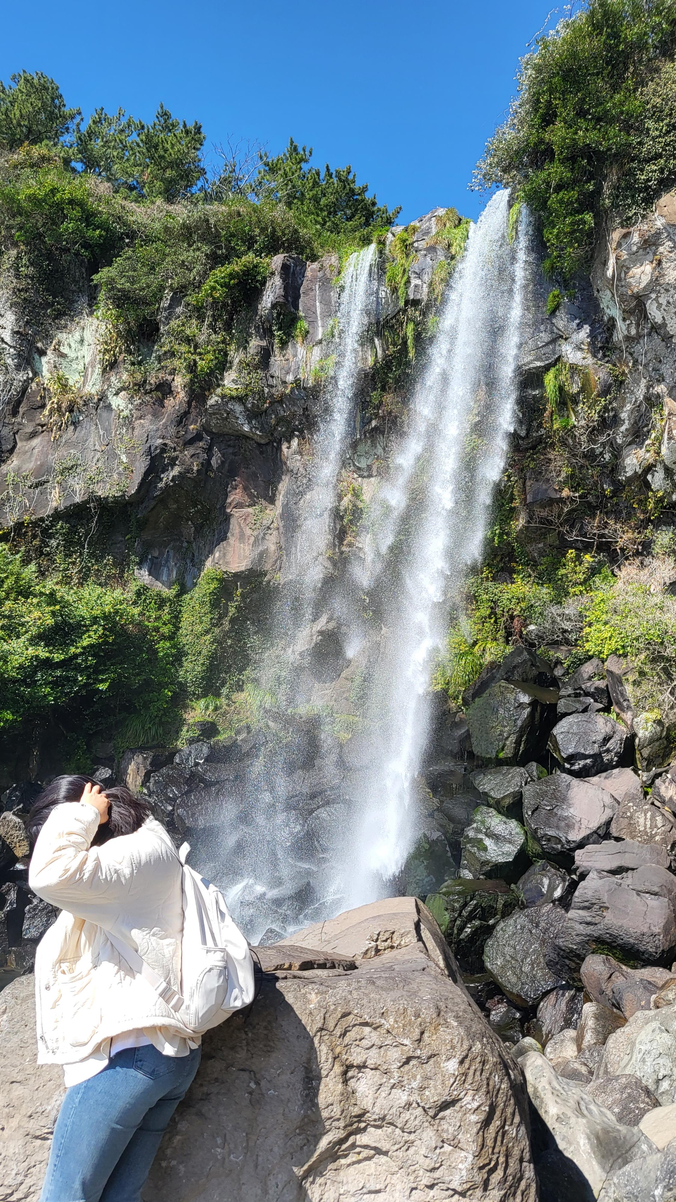 정방폭포는 폭포와 바다가 만나는 아름다운 장관이 펼쳐지는 곳인데요. 입장하는 순간부터 와하는 소리가 입에서 나오더라구요. 폭포 가까이에서 사진 찍을 때는 돌이 울퉁불퉁해 넘어질 위험이 있으니 조심하셔야 합니다!