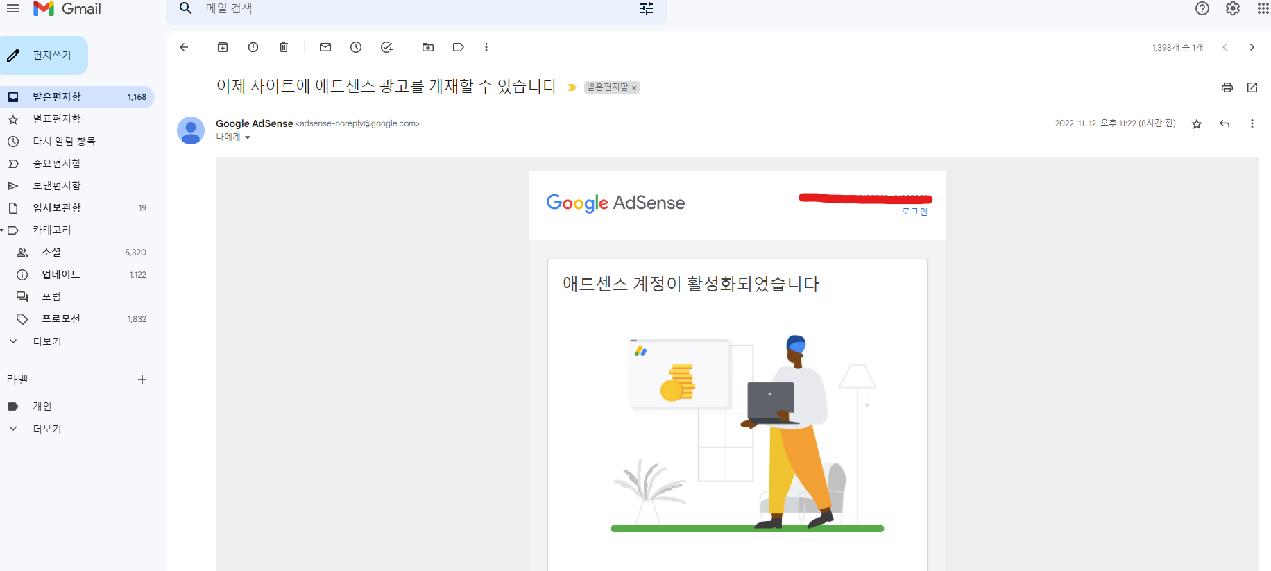 이렇게 애드센스 계정이 활성화 되었다는 메일을 받게 되었답니다~~!!