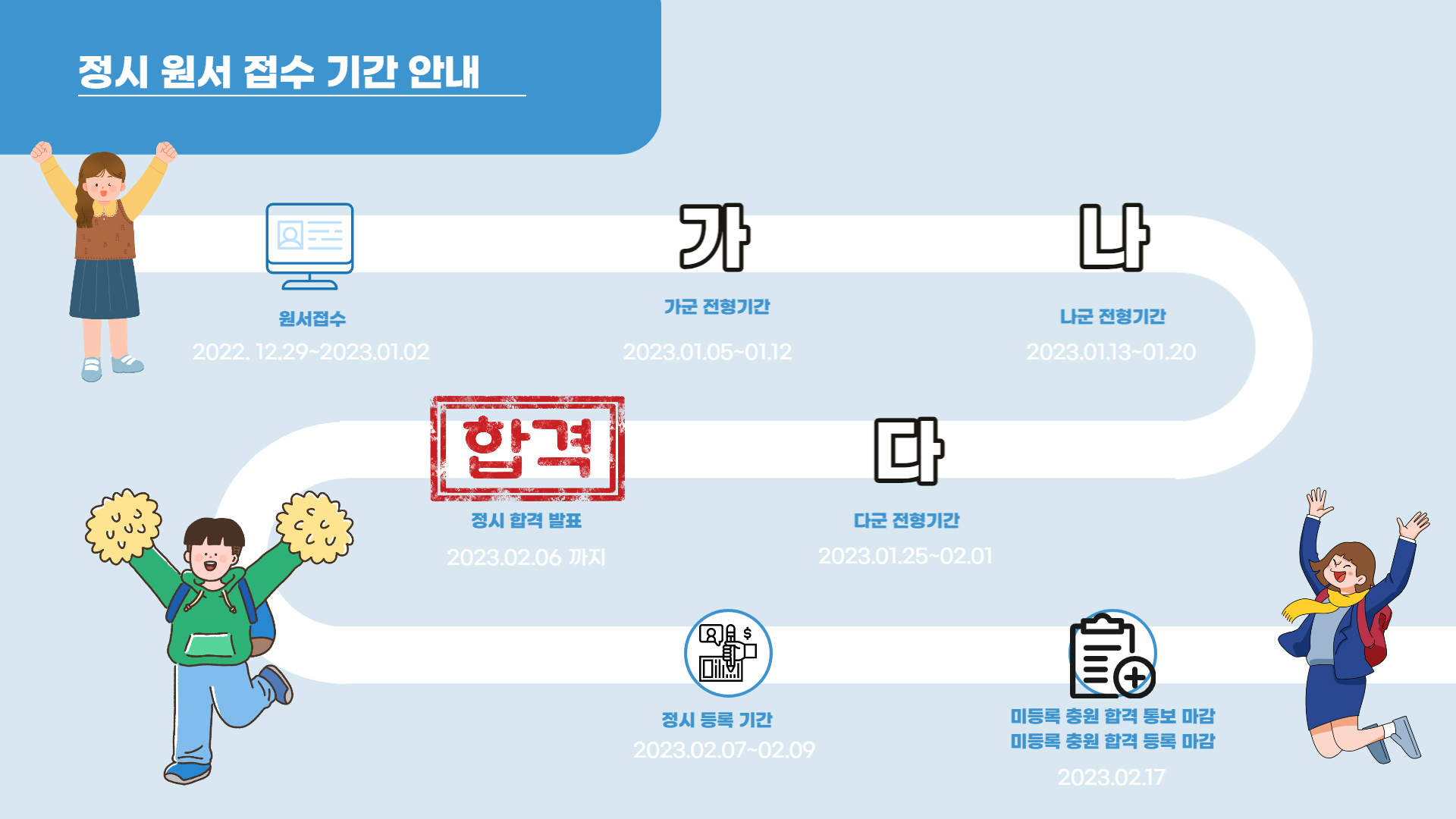 지금까지 정시 원서 접수 기간에 대해서 안내드렸습니다. 성적표를 보고 잘 고민하셔서 원하는 대학에 꼭 합격하시길 바라겠습니다.