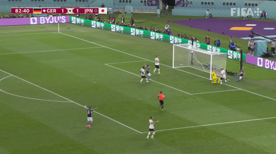 마지막 독일이 코너킥을 성공시키지 못하면서 이렇게 일본의 승리로 대이변의 결과를 가져오며 독일과 일본의 경기가 종료됩니다.